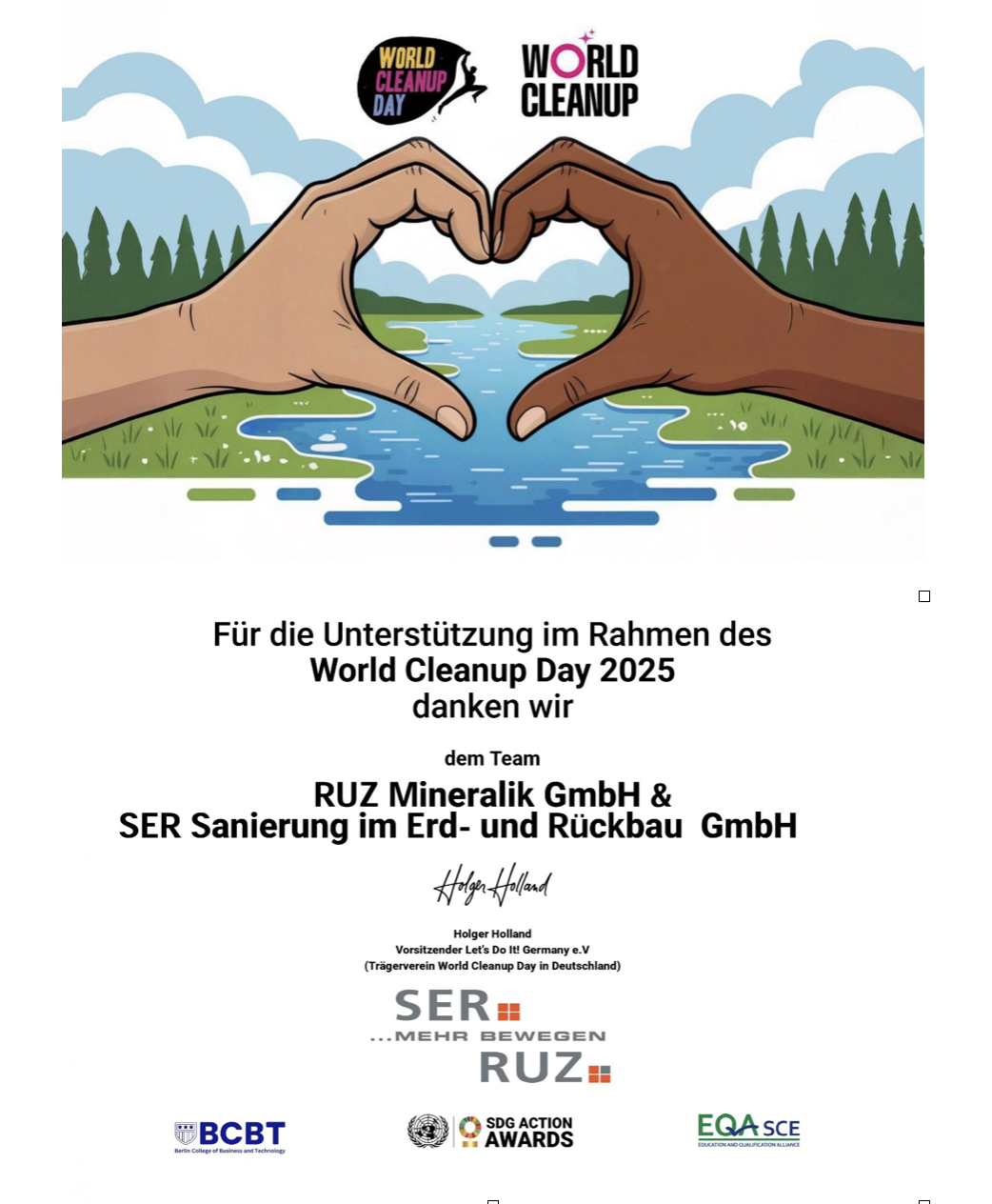 Am 19. September 2025 war es für uns wieder so weit: bereits zum 4. Mal haben die SER + RUZ GmbH mit Millionen von Menschen anlässlich des World Cleanup Days ein starkes Zeichen für eine saubere Umwelt gesetzt!